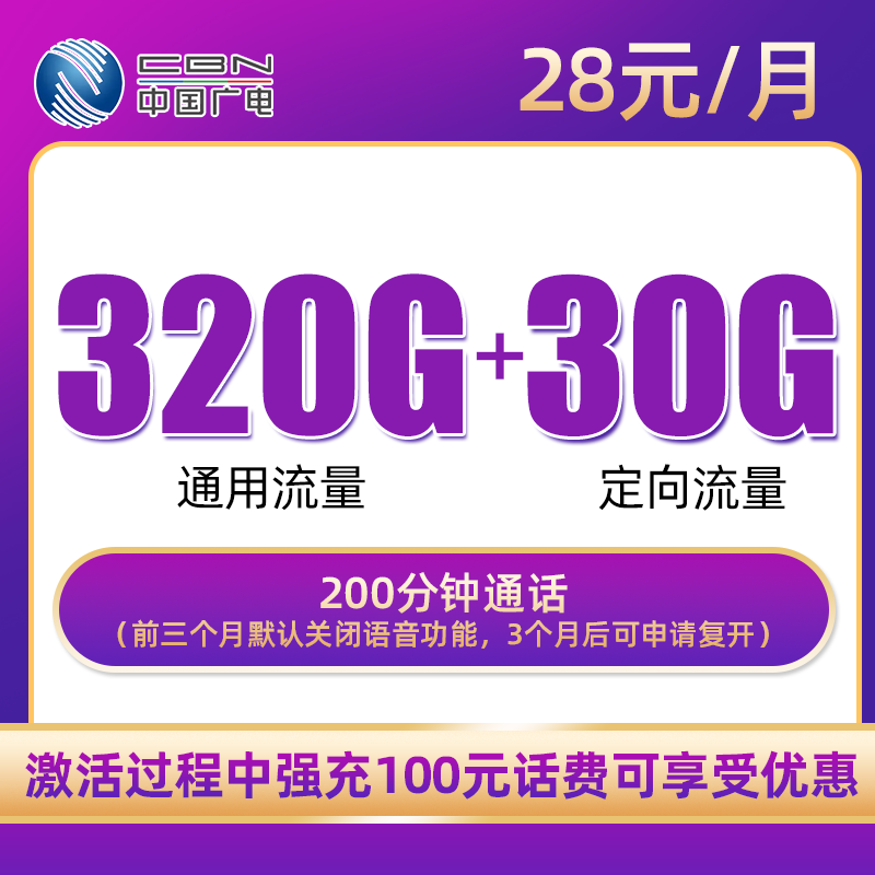 320G通用流量+30G定向流量+200分钟通话(仅发湖南)